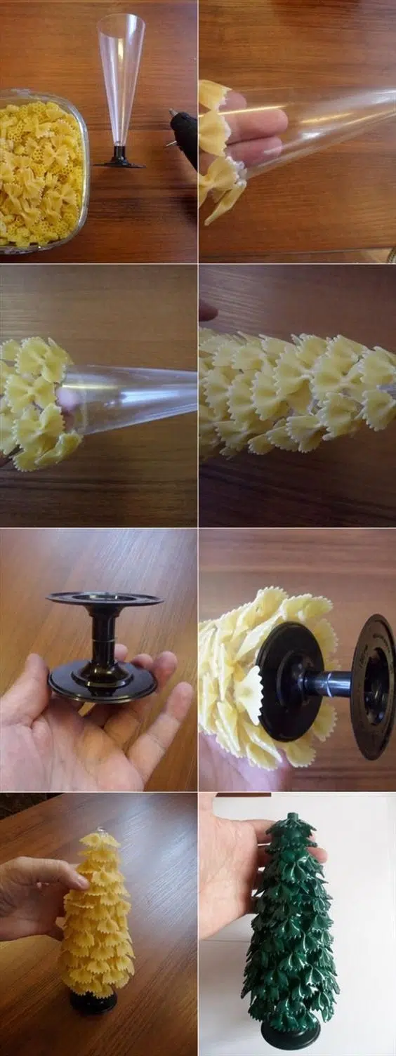 Pour faire ce petit arbre de Noël original, il suffit d’utiliser des tasses à champagne en plastique et de coller des pâtes dedans !