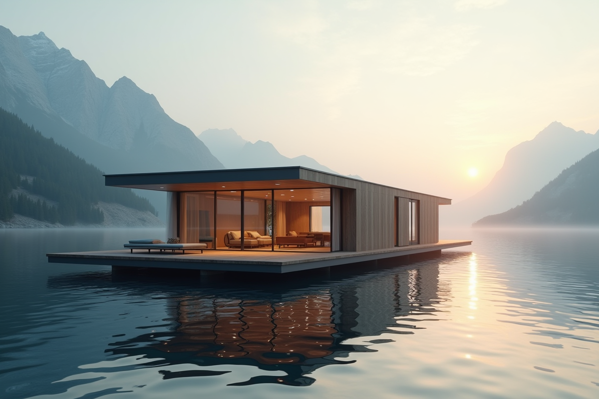 - Les maisons sur pontons, idéales pour les lacs et les rivières, utilisent des structures flottantes modulaires qui assurent une grande stabilité.